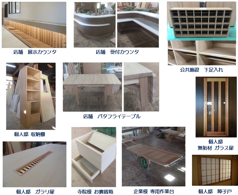 | 住宅家具、店舗カウンタ、テーブル、扉、など・・・様々なオーダー品を施工図作成のうえ、製造しております。 | |||||||||||||||||