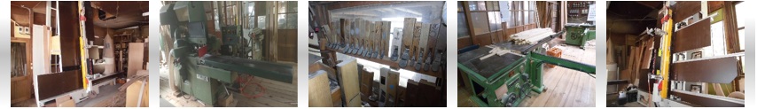 | 大型パネルソー(2台) 長尺プレス機(2台) 小口プレス機 スライド横切り盤 (3台) 昇降盤 (3台) ホゾ取り機(3台) ホゾ製造盤 自動カンナ盤(2台) モルダー機 手押しカンナ盤(2台) リプソー盤(2台) ボール盤 帯ノコ盤 コンプレッサ機 他。 |